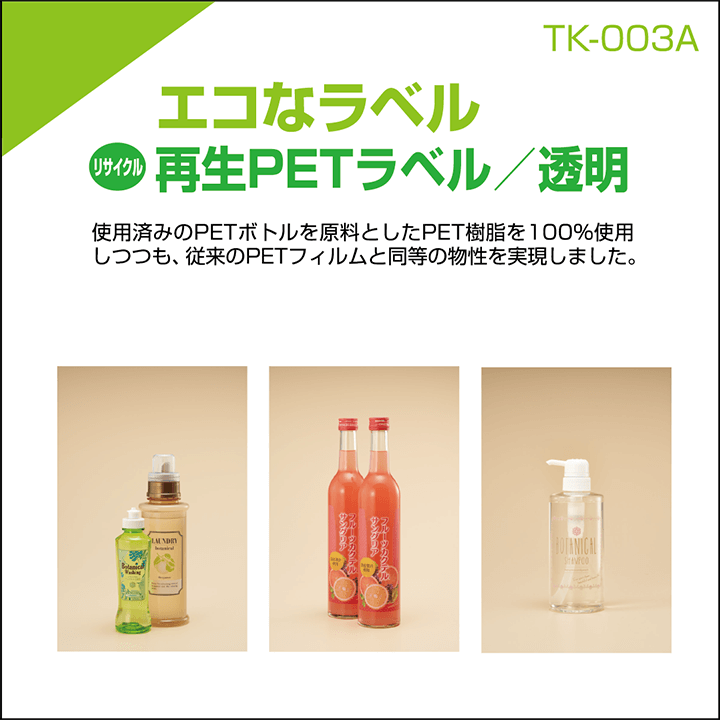 再生PET樹脂を原料としたフィルムを用いた環境に配慮したラベルです。50μmは銀ツヤと透明の2種類、38μmは透明があります。